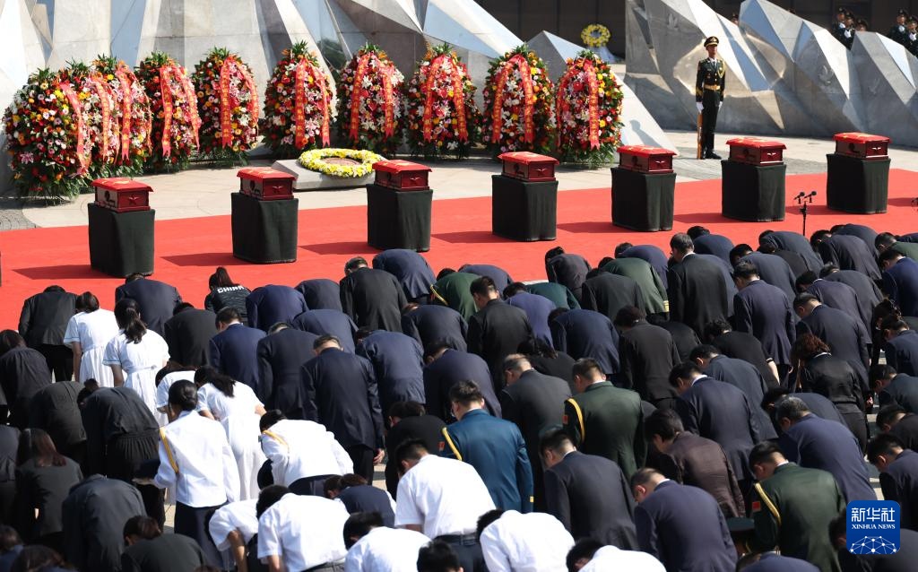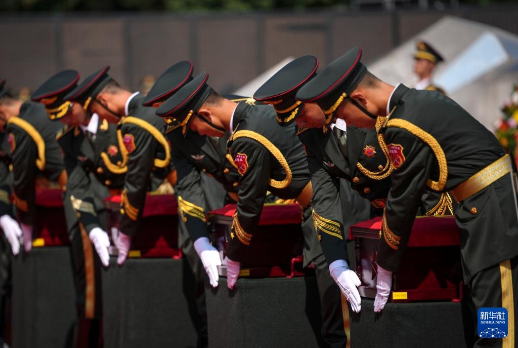 9月13日,參加安葬儀式的各界代表向志愿軍烈士遺骸鞠躬。新華社記者 楊青 攝