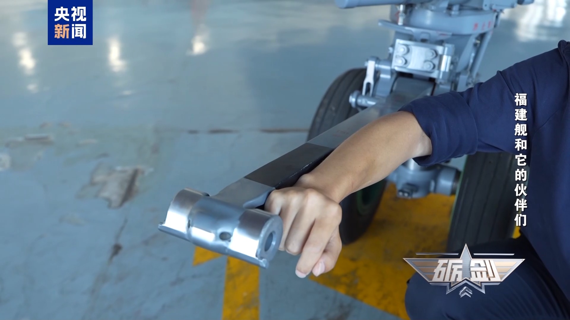 在沈飛的機庫,記者看到兩架殲15-T飛機一前一后停放著,殲-15T的“T”是漢語拼音“tán”的首字母。彈射桿是殲-15T飛機為彈射起飛專門量身制造的。它能直接鉤住航母甲板上的電磁彈射器,瞬間就能把幾十噸重的殲-15T從靜止的狀態(tài)加速到幾百公里每小時,拽著戰(zhàn)機沖離甲板。