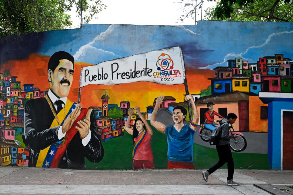 12月2日,行人從支持委內(nèi)瑞拉總統(tǒng)馬杜羅的涂鴉墻前走過。