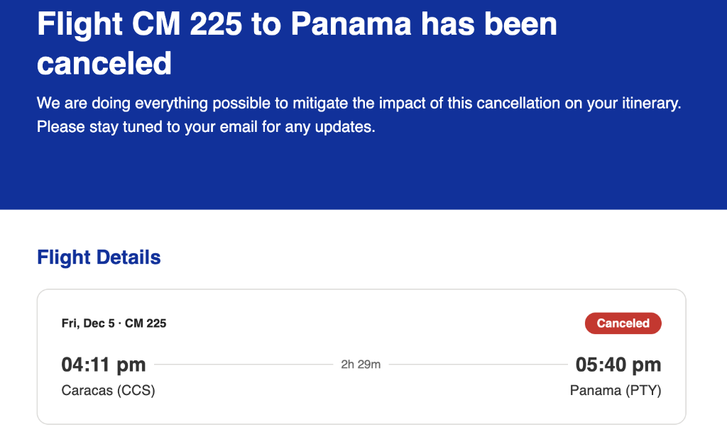 12月3日,巴拿馬航空暫停往返委內(nèi)瑞拉首都加拉加斯的航班。記者原定12月5日從加拉加斯飛往巴拿馬城的航班被取消。(電腦截圖)