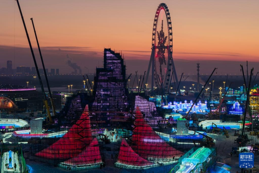 這是12月10日拍攝的哈爾濱冰雪大世界主塔施工現(xiàn)場(無人機(jī)照片)。新華社記者 張濤 攝