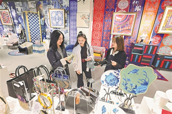 4月24日,北京市豐臺區(qū)的一家服飾公司內(nèi),工作人員正在向顧客介紹采用傳統(tǒng)紋樣設(shè)計的服飾及文創(chuàng)產(chǎn)品。