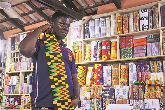 圖為在加納阿散蒂省庫(kù)馬西市,一名男子在商店內(nèi)展示“肯特布”。
