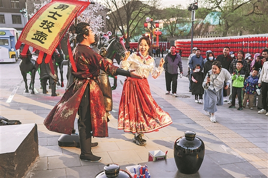4月24日,北京市延慶區(qū),游客在景區(qū)內(nèi)與演員互動(dòng),體驗(yàn)投壺游戲。