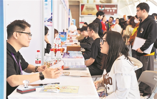 4月26日,求職者與用人單位代表交流。 當日,廣東省“百萬英才匯南粵”2025年N城聯(lián)動春季招聘活動(南京站)在南京國際展覽中心舉行?;顒右浴盎浘塾⒉?粵見未來”為主題,廣邀高校學子、青年人才共赴灣區(qū)之約,共同譜寫粵港澳大灣區(qū)與長三角兩大經(jīng)濟高地發(fā)展“雙城記”。