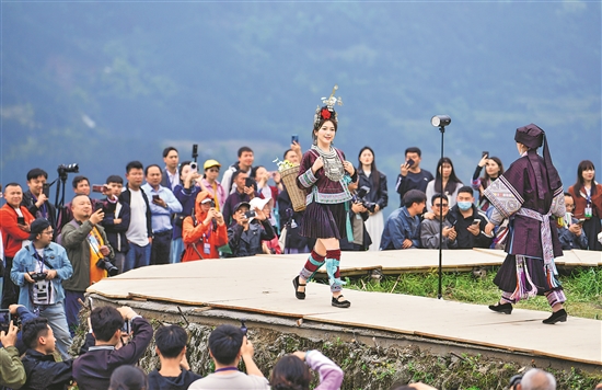 4月26日,村民在貴州省從江縣加榜梯田上參加梯田走秀活動(dòng)。