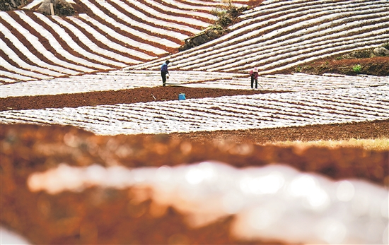 近日,云南省紅河哈尼族彝族自治州彌勒市巡檢司鎮(zhèn),農民在田間勞作,構成一幅優(yōu)美詩意的田園畫卷。視覺中國 供圖