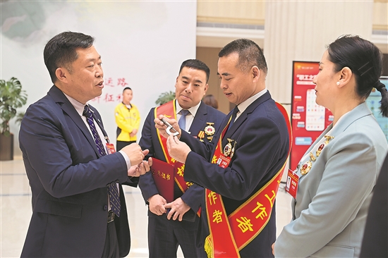 4月27日,在中國(guó)職工之家,全國(guó)勞動(dòng)模范、通用技術(shù)齊齊哈爾二機(jī)床有限責(zé)任公司馬恒昌小組組長(zhǎng)馬兵(左一)向即將接受表彰的全國(guó)勞模講述馬恒昌小組千分尺的故事。1948年,為了支援前線,馬恒昌曾捐獻(xiàn)過(guò)這樣一把千分尺,讓企業(yè)用于生產(chǎn)。1950年9月,馬恒昌小組被評(píng)為全國(guó)勞動(dòng)模范小組,馬恒昌被評(píng)為全國(guó)勞動(dòng)模范。今年4月28日是馬恒昌小組建組76周年。本報(bào)記者 吳凡 攝