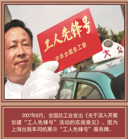 2007年8月,全國(guó)總工會(huì)發(fā)出《關(guān)于深入開展創(chuàng)建“工人先鋒號(hào)”活動(dòng)的實(shí)施意見》。圖為上海出租車司機(jī)展示“工人先鋒號(hào)”服務(wù)牌。
