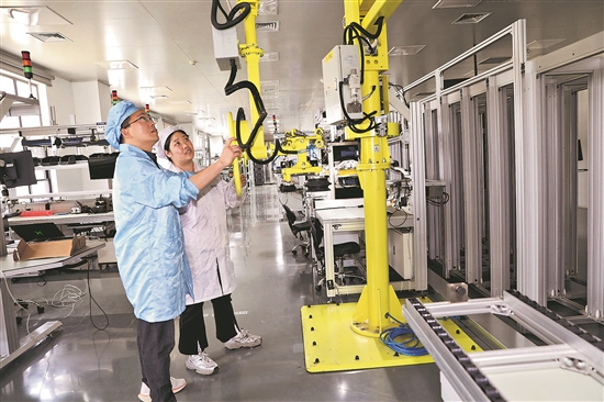 繼柔性智能加工單元、智能化無(wú)人值守溫度循環(huán)試驗(yàn)測(cè)試系統(tǒng)先后投入運(yùn)行后,近日,航天三江險(xiǎn)峰公司再添射頻前端裝調(diào)一體式、智能產(chǎn)成品存取模塊和智能艙段立體存取模塊3條智能化生產(chǎn)線。圖為該公司智能化產(chǎn)線負(fù)責(zé)人與總裝車間裝配班職工一道查看產(chǎn)線運(yùn)行情況。張玉蓮 攝