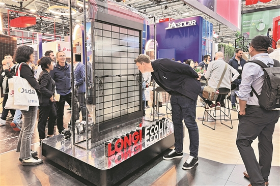 5月8日,參觀者在德國(guó)慕尼黑舉行的2025年歐洲國(guó)際太陽(yáng)能展上參觀隆基綠能展區(qū)。