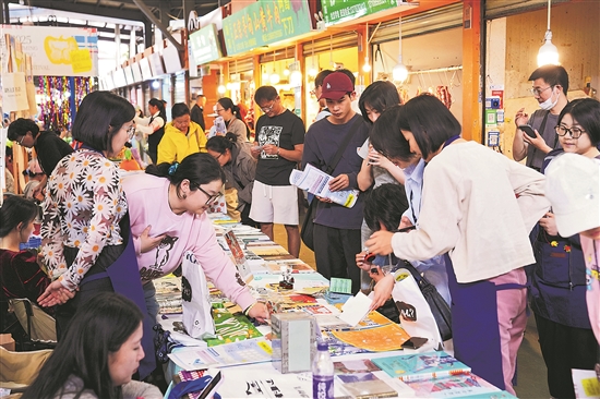 市場(chǎng)內(nèi),200余個(gè)生鮮攤位與40余家書店展位相鄰而設(shè);市場(chǎng)外,“藝術(shù)落入煙火深處”“怪物街市在菜場(chǎng)”“刀鋒圖書獎(jiǎng)特展”“緬甸飲料攤”4個(gè)藝術(shù)展吸引不少市民游客駐足觀賞。