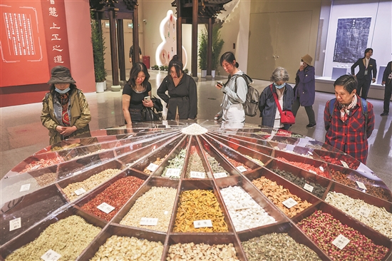 該展覽以非物質(zhì)文化遺產(chǎn)代表性項目為主要載體,以中醫(yī)藥來自人們生產(chǎn)生活實踐,歷經(jīng)創(chuàng)新發(fā)展,又融入現(xiàn)代生活并煥發(fā)活力的脈絡(luò)為主線,通過營造坐堂行醫(yī)、古人養(yǎng)生生活、中藥炮制、中醫(yī)藥仿古街區(qū)、百草園等多個空間場景,輔以多媒體交互體驗、非遺技藝展示等方式,讓觀眾體會到中醫(yī)藥文化的博大精深和中醫(yī)藥非遺項目的蓬勃生命力。