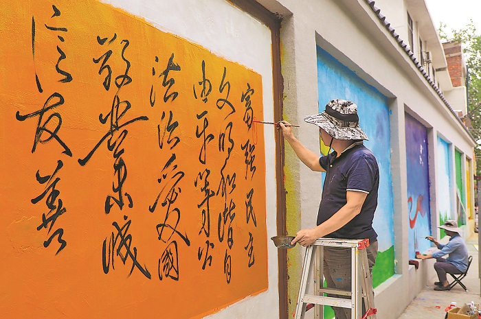 5月10日,湖南省邵東市兩市塘街道文化社區(qū),繪畫人員正在墻繪創(chuàng)作。近年來,邵東市以文化墻引領(lǐng)文明新風(fēng)尚,在美化、亮化街道上下功夫,以市民喜聞樂見的方式倡導(dǎo)新文明、宣揚新風(fēng)尚,讓文化墻展現(xiàn)美麗城市新風(fēng)貌。本報通訊員 李世近 攝