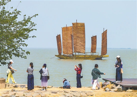 5月11日,游客在江蘇省淮安市洪澤湖畔的周橋大塘景區(qū)拍照游玩。