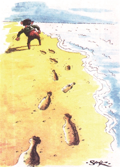 嗜酒如命的癮君子一路醉步走來,在沙灘上留下串串酒瓶痕跡。作者可謂想象力豐富、比喻生動,是絕好寓教于樂的范例。