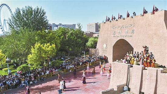 近日,游客在喀什古城景區(qū)觀看開城儀式。