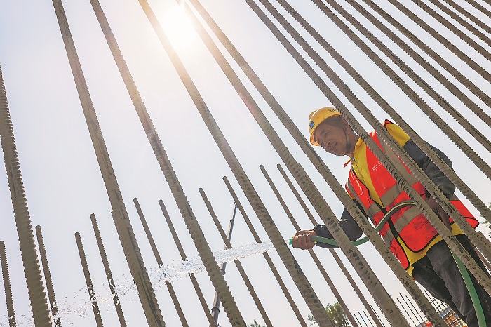 6月22日,北京市潮白河綜合治理與生態(tài)修復(fù)工程(通州段)施工8標(biāo),中建三局的施工人員正在對(duì)混凝土進(jìn)行養(yǎng)護(hù)。當(dāng)日,北京市最高氣溫達(dá)37攝氏度,不少戶外工作場(chǎng)所通過(guò)延后午后工作時(shí)間,或錯(cuò)時(shí)施工,避開(kāi)高溫時(shí)段。