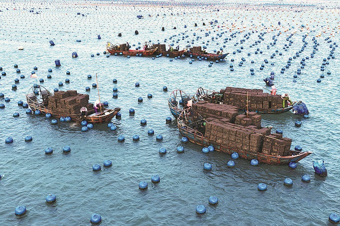 6月21日,在福州市連江縣下宮鎮(zhèn)松蘆灣海域,漁民在養(yǎng)殖區(qū)采收鮑魚(yú)。連江縣素有“中國(guó)鮑魚(yú)之鄉(xiāng)”的美譽(yù),眼下連江縣松蘆灣海域1.2萬(wàn)畝鮑魚(yú)養(yǎng)殖區(qū)的5億粒鮑魚(yú)正陸續(xù)上市,新鮮肥美的夏鮑將銷(xiāo)往全國(guó)各大市場(chǎng)。本報(bào)通訊員 王旺旺 攝