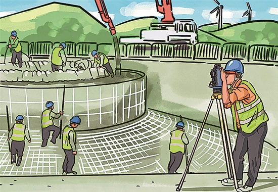 F61風機的基礎澆筑也在同步進行。再次確認風機錨栓籠平整度準確無誤后,項目工長李陸太指揮施工隊伍將兩臺天泵架設完畢,開始了風機基礎澆筑作業(yè)。“風機基礎必須嚴格按照計劃,在24小時內澆筑完畢、一次成型。”技術員馬爽予說。