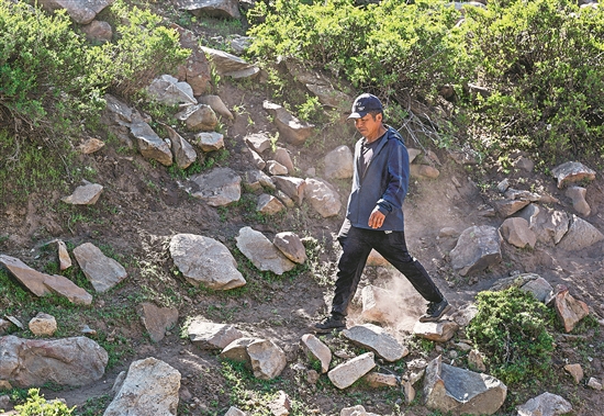 從張永軍的家通往巖畫(huà)的山路大約有5公里,這條崎嶇難行的山路,他走了8年,鞋子磨破了一雙又一雙,腳步始終堅(jiān)定如初。張永軍的付出得到了認(rèn)可。他被評(píng)為“新疆最美文物安全守護(hù)人”。