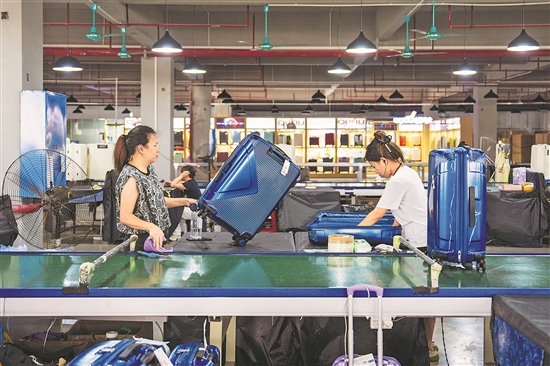 6月23日,在藍山縣皮具箱包科技產(chǎn)業(yè)園一家箱包生產(chǎn)企業(yè),工人在趕制行李箱。