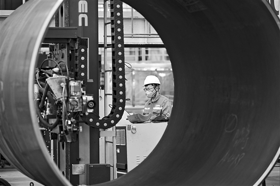 6月20日,工作人員在海油工程天津智能制造基地制管作業(yè)車間內(nèi)操控設(shè)備。