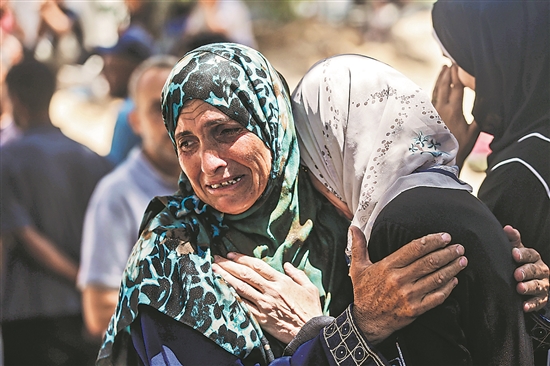 圖為當?shù)貢r間6月25日,巴勒斯坦人在加沙城一所醫(yī)院悼念以軍襲擊中的遇難者。