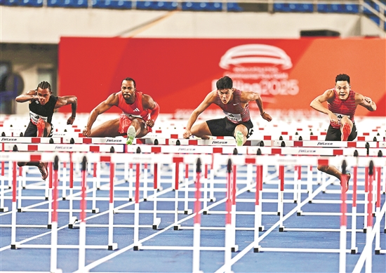 在男子110米欄決賽中,陳圓將(右二)以13秒27獲得季軍。本報記者 王羨茹 攝