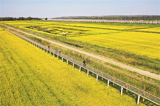 內(nèi)蒙古準(zhǔn)格爾旗大路鎮(zhèn)小灘子村沿黃河分布有大面積的鹽堿地。近年來,當(dāng)?shù)卦邴}堿地上種植耐鹽堿水稻,發(fā)展水產(chǎn)養(yǎng)殖,將鹽堿地打造成集農(nóng)業(yè)生產(chǎn)、旅游觀光等為一體的生態(tài)觀光園。圖為9月9日游客在觀光園游玩。新華社記者 李志鵬 攝