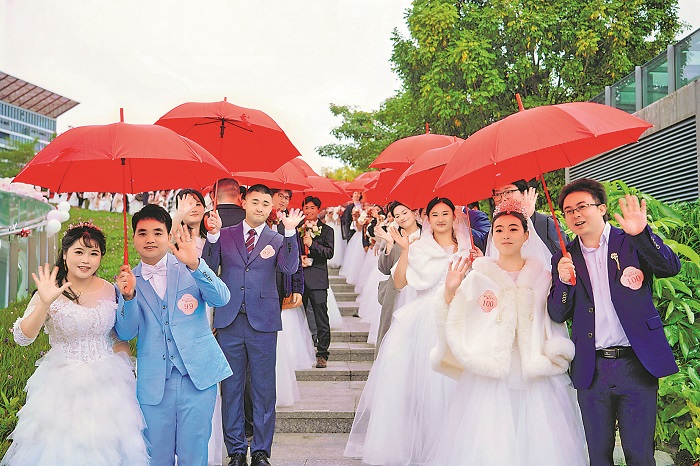據(jù)悉,寶安工會(huì)打造的“寶工之約”單身職工交友平臺(tái),已累計(jì)舉辦120場(chǎng)線下專(zhuān)場(chǎng)活動(dòng)。圖為交友聯(lián)誼活動(dòng)集體婚禮現(xiàn)場(chǎng)。本報(bào)記者 劉友婷 本報(bào)通訊員 羅義國(guó) 攝