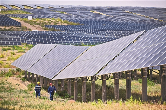 內(nèi)蒙古鄂爾多斯市達(dá)拉特旗境內(nèi)的庫布其沙漠里,一塊塊藍(lán)色光伏板鱗次櫛比、鋪陳排開,將沙海變成綠能涌動的“藍(lán)?!薄=陙?,達(dá)拉特旗依托光伏基地建設(shè),推廣應(yīng)用“光伏治沙”模式,實(shí)現(xiàn)光伏板上發(fā)綠電,板下治理沙漠生態(tài),既帶動新能源產(chǎn)業(yè)發(fā)展,也促進(jìn)庫布其沙漠治理。