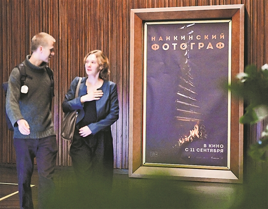 圖為近日,在俄羅斯莫斯科一家電影院,觀眾經(jīng)過電影《南京照相館》的海報(bào)。