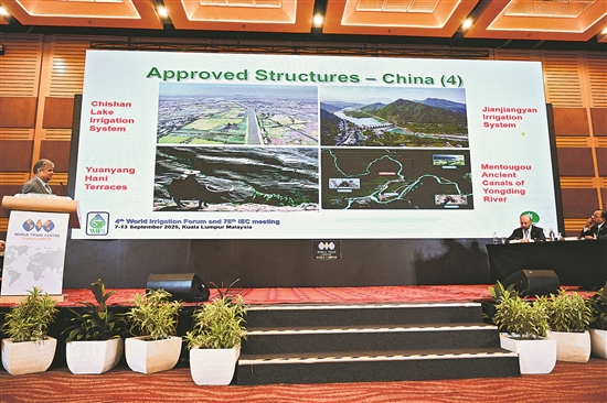 當?shù)貢r間9月10日上午在馬來西亞吉隆坡召開的國際灌排委員會第76屆國際執(zhí)行理事會會議上,2025年(第十二批)世界灌溉工程遺產(chǎn)名錄正式公布,我國申報的云南元陽哈尼梯田、江蘇句容赤山湖灌溉工程、四川彭州湔江堰、北京門頭溝永定河古渠灌溉工程等4個工程成功入選。至此,中國的世界灌溉工程遺產(chǎn)總數(shù)已達42項。這是在馬來西亞吉隆坡拍攝的國際灌排委員會第76屆國際執(zhí)行理事會會議現(xiàn)場。新華社記者 程一恒 攝