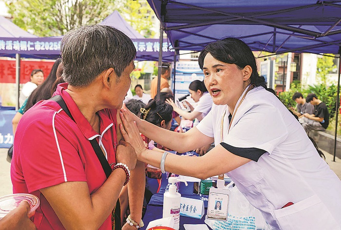 當(dāng)日,銅仁市中醫(yī)院開(kāi)展健康義診活動(dòng)。醫(yī)生走進(jìn)萬(wàn)山區(qū)丹都街道旺家社區(qū),免費(fèi)給市民進(jìn)行血壓、血糖、視力等檢查,深受群眾贊譽(yù)。本報(bào)通訊員 胡攀學(xué) 攝