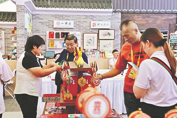 9月11日,觀眾在服貿(mào)會(huì)11號(hào)館“北京禮物”展位前挑選兔爺擺件。