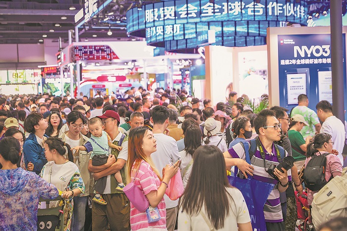 9月14日,北京首鋼園服貿(mào)會(huì)1號(hào)館主題展展區(qū),觀眾們摩肩接踵。