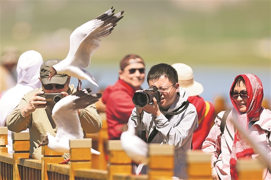 圖為游客在甘肅省甘南藏族自治州碌曲縣尕海濕地近距離拍攝、觀賞棕頭鷗。