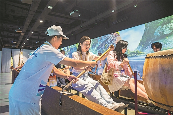 9月16日,在湖南省懷化市五溪非遺園,游客在體驗(yàn)劃龍舟。五溪非遺園于2025年5月正式開(kāi)園。懷化以五溪非遺園為抓手,探索非遺保護(hù)傳承新模式,讓傳統(tǒng)技藝成為城市發(fā)展的文化動(dòng)力。新華社記者 陳思汗 攝