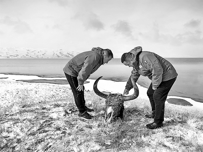 2023年10月16日,巡護人員在新疆阿爾金山國家級自然保護區(qū)內查看死亡野牦牛的頭骨。新華社記者 李響 攝