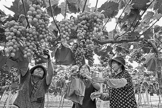 9月16日,村民在山東省肥城市老城街道河口村的肥城市河興農(nóng)業(yè)專業(yè)合作社葡萄草莓種植基地收獲葡萄。