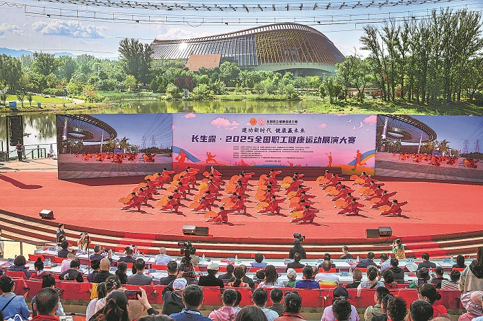 9 月 19 日,2025全國職工健康運動展演大賽在北京世園公園開幕。大賽以“建功新時代,健康贏未來”為主題,設(shè)工間操、太極拳、健身瑜伽、籃球等八大項目,近3000名職工參賽。圖為開幕式現(xiàn)場,職工表演太極扇。本報記者 吳凡 攝