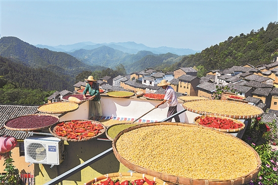 秋收時節(jié),在歙縣深渡鎮(zhèn)陽產(chǎn)村,村民利用晴好天氣,抓緊晾曬收獲的辣椒、玉米、山核桃等農(nóng)作物,描繪出一幅山村“曬秋”圖。