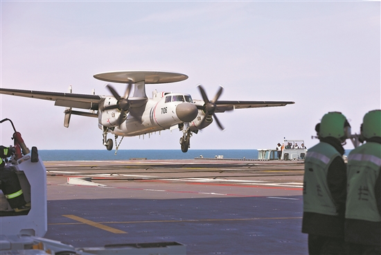 圖為空警-600艦載預警機在福建艦阻攔著艦(資料照片)。