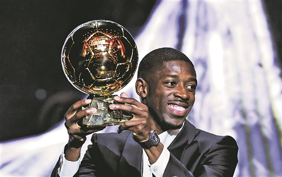 巴黎圣日耳曼隊法國球員登貝萊在頒獎儀式上與獎杯合影。新華社記者 高靜 攝
