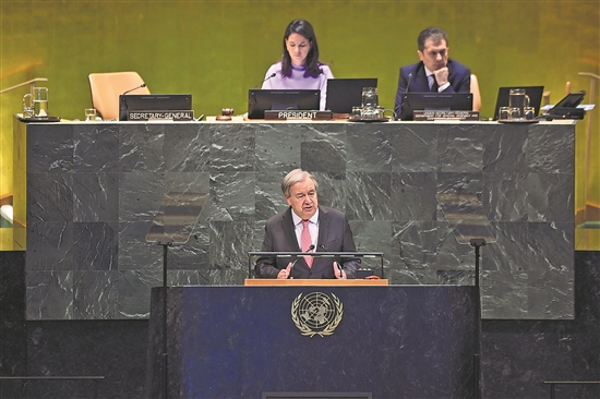 圖為當(dāng)日,在位于紐約的聯(lián)合國總部,聯(lián)合國秘書長古特雷斯在紀(jì)念北京世婦會(huì)30周年高級(jí)別會(huì)議上講話。