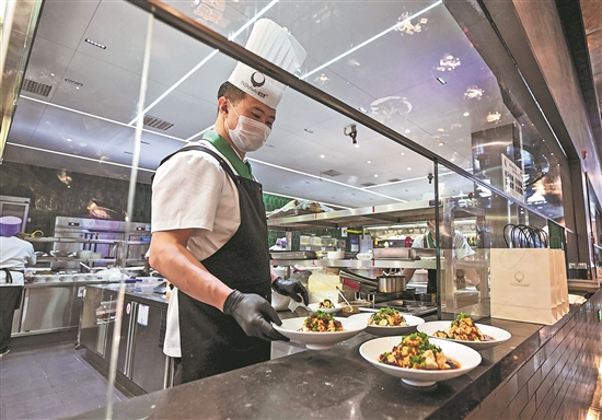 9月24日,寧夏吳忠市一家早茶店廚師將做好的小吃遞到窗口。
