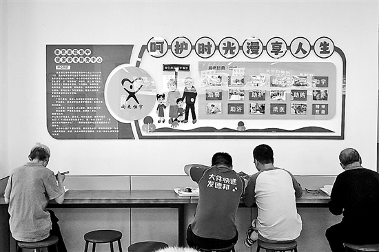 9月22日,江蘇省南京市雨花臺區(qū)賽虹橋街道的小米行大食堂內(nèi),快遞員、建筑工人和當(dāng)?shù)鼐用裾谟貌汀?/p>