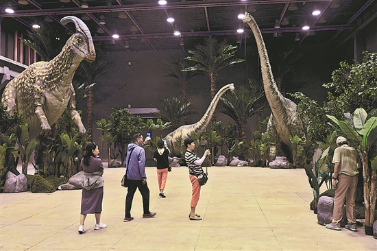 9月25日,江蘇省無錫市國家數(shù)字電影產(chǎn)業(yè)園,游客在仿生恐龍電影道具前拍照。