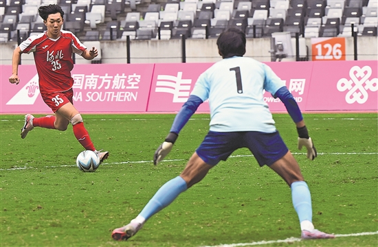 11月11日,河北隊(duì)球員陳天樂(左)在比賽中帶球突破。新華社記者 郝源 攝
